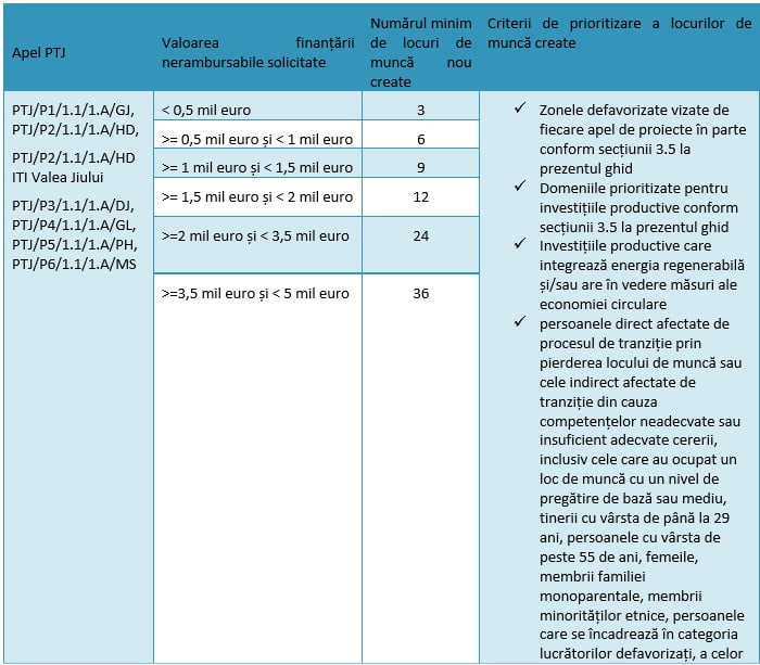 Proiectul trebuie sa conducă la crearea de noi locuri de munca, direct legate de investitia finantata, ce trebuie mentinute pe o perioada de cel puțin 3 ani după finalizarea investitiei, în zona vizată de apel.